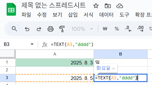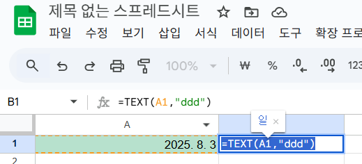 👉 결과: A1 셀의 날짜에 해당하는 요일을 B1에 “월”, “화”, “수” 등의 문자로 반환합니다.