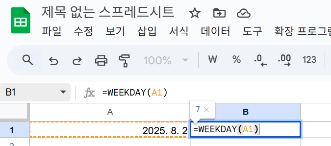 기본적으로 구글 시트에서는 1=일요일, 2=월요일, …, 7=토요일을 의미합니다.